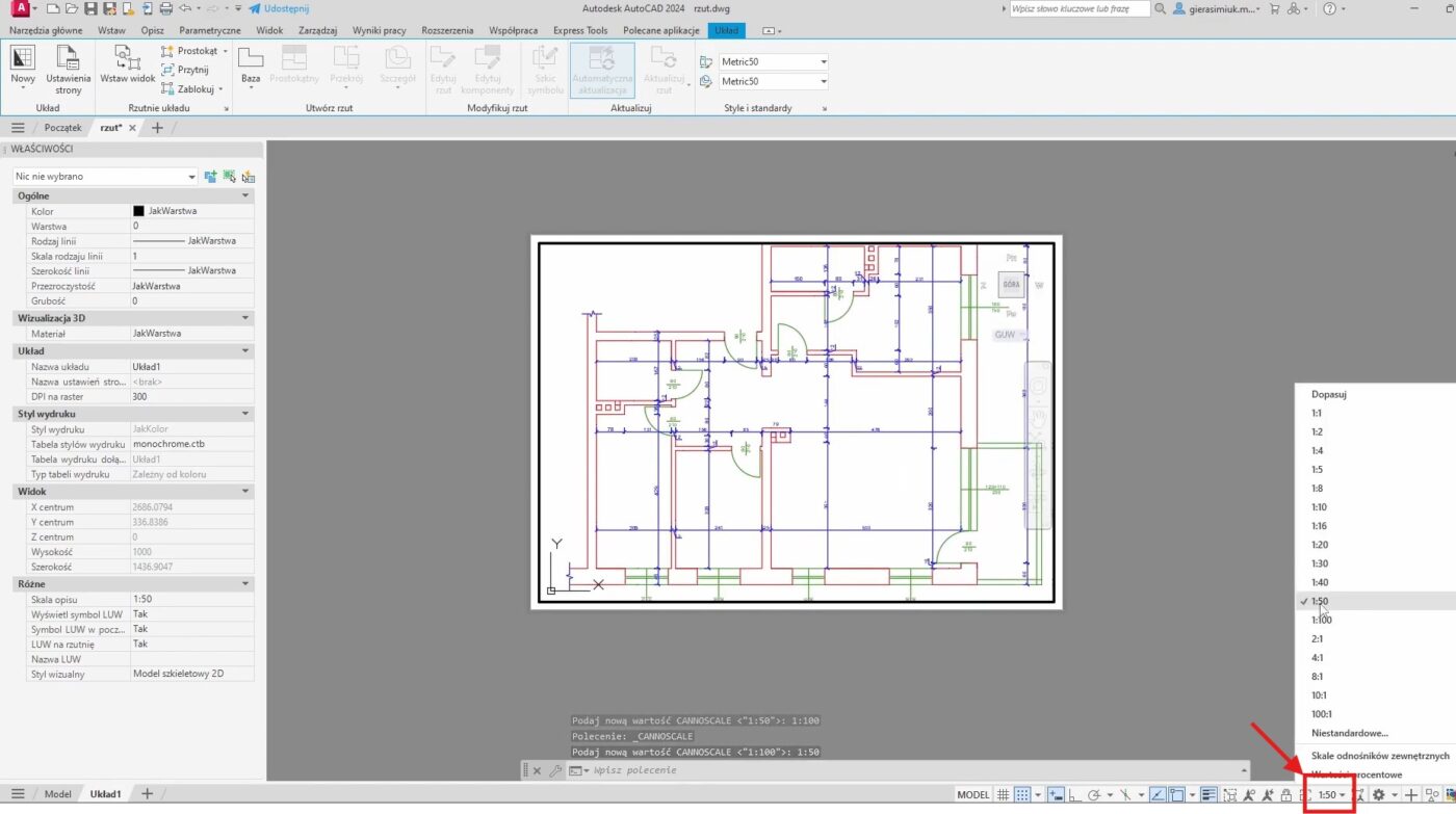 To kluczowy moment, w którym dopasowujemy jednostki z naszego modelu do jednostek na kartce papieru. Załóżmy, że Twój rysunek (np. rzut mieszkania) został wykonany w centymetrach – czyli drzwi o szerokości 90 cm mają w modelu 90 jednostek. Kartka papieru jest natomiast opisywana w milimetrach.