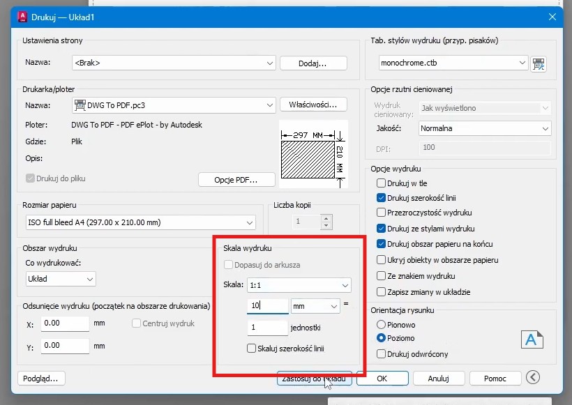 Aby ujednolicić te jednostki, w sekcji „Skala wydruku” ustaw: 10 mm = 1 jednostka