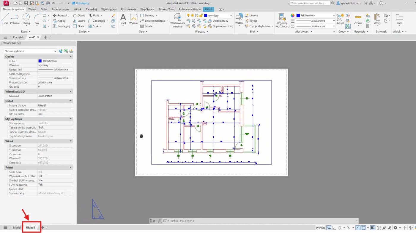 Domyślnie pracujemy w przestrzeni Modelu, gdzie tworzymy nasz rysunek w skali 1:1. Aby przygotować go do druku, przechodzimy do przestrzeni Układu.