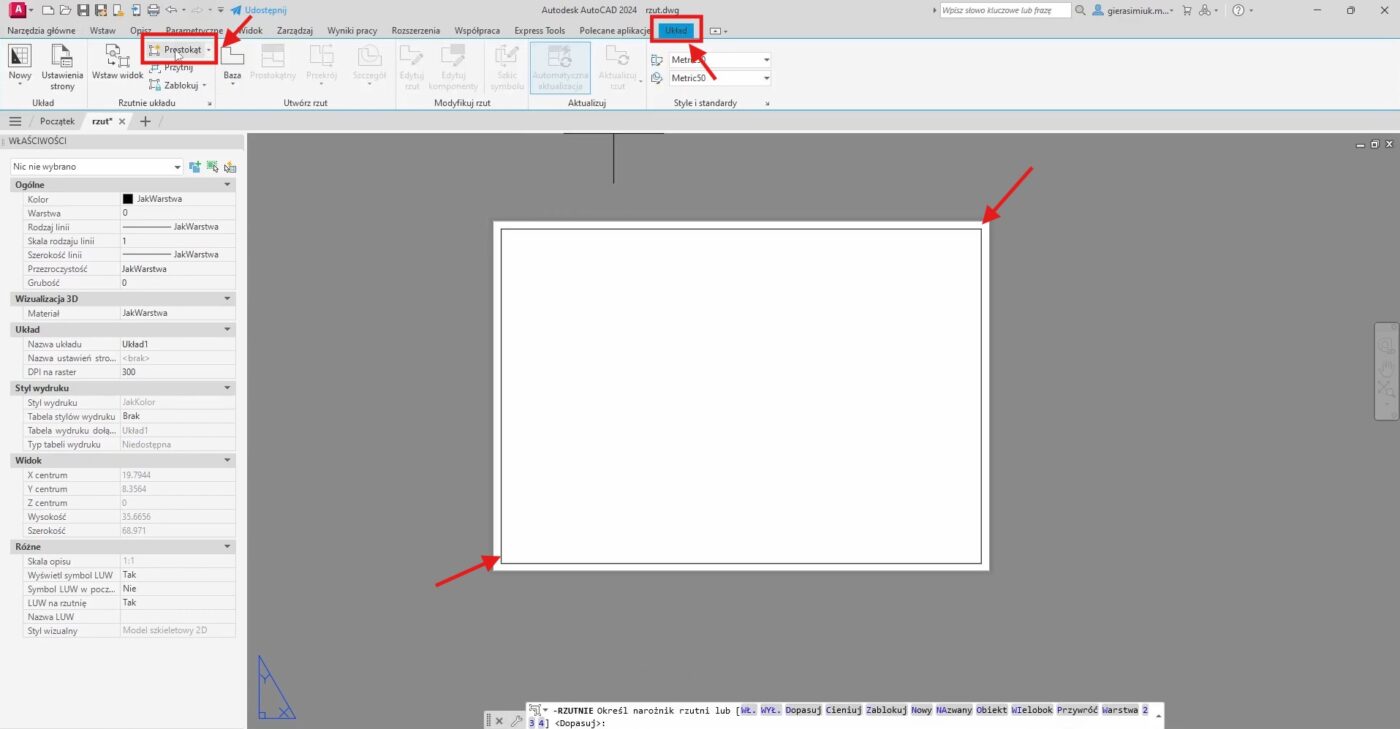 Mając gotową kartkę, musimy stworzyć na niej „okno”, które będzie patrzyło na nasz rysunek w modelu. To okno, nazywane rzutnią, pozwoli nam precyzyjnie ustawić skalę projektu.