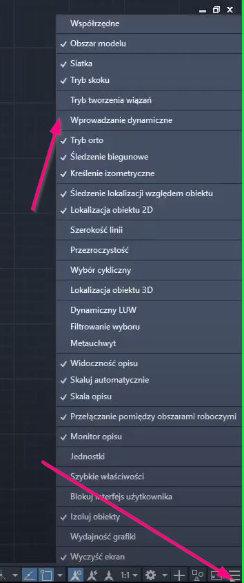 Najpierw upewnijmy się, że ikona tej funkcji jest w ogóle widoczna. W prawym dolnym rogu interfejsu kliknij ikonę trzech poziomych linii (Dostosowanie). Na liście, która się pojawi, znajdź i zaznacz opcję Wprowadzanie dynamiczne. To sprawi, że jej ikona pojawi się na pasku stanu. Dopiero teraz sprawdź, czy ta ikona na pasku jest podświetlona na niebiesko. Jeśli nie, kliknij ją, aby aktywować.
