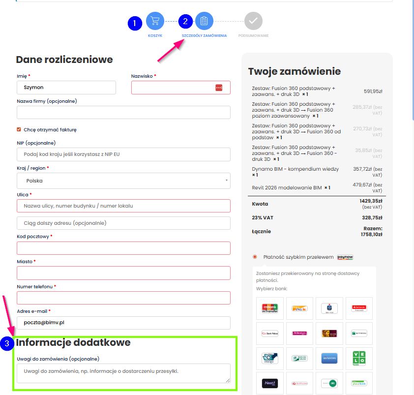 | 2. Wpisz Imię i nazwisko oraz adres E-mail Obdarowanego (patrz grafika poniżej) | TO JEST KLUCZOWE! W polu „Uwagi do zamówienia” (lub „Dodatkowe informacje”) wpisz: Prezent dla: <adres_email_osoby_obdarowanej> <Imię> <Nazwisko> Należy podać adres email osoby której chce się podarować prezent. Do tego konta zostanie przypisany kurs. Jeśli okaże się w trakcie wręczania prezentu ze email jest nieaktywny, lub osoba ma adres z którego częsciej korzysta, wystarczy to zgłosić na poczta@bimv.pl i przeniesiemy kursy na wybrane inne konto. |